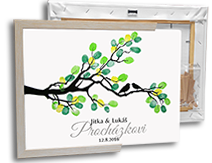 Jedinečná vzpomínka na svatební den. Strom má jen větvičky bez lístků. Lístky vytváří svatebčané různě barevnými otisky prstů.
