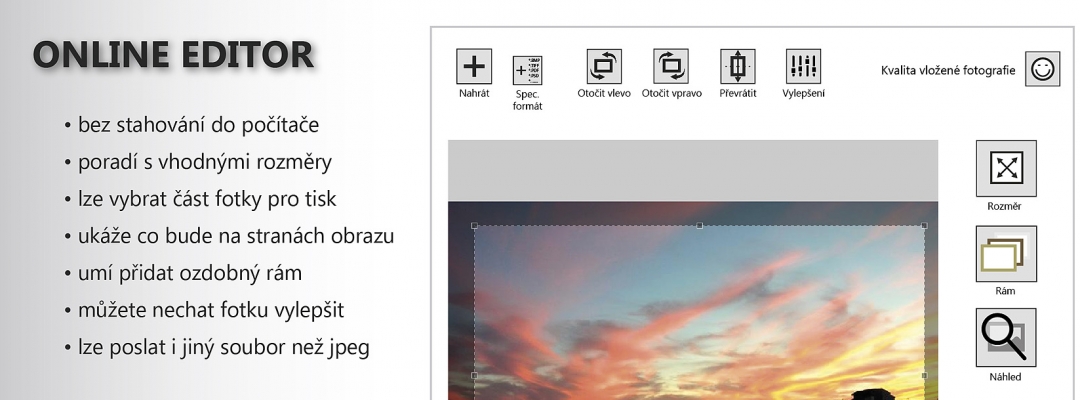 Vše vytvoříte v chytrém online editoru, který Vám poradí s vhodným rozměrem, umožní vybrat výřez a zobrazí okraje obrazu. Můžete nahrát i 200MB soubory v různých formátech.